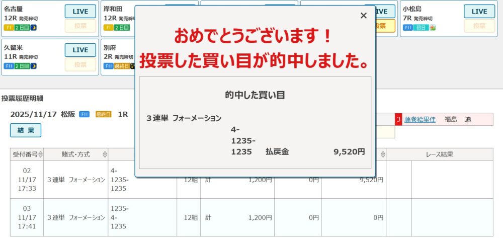 もちろん一人でリビング。今日は2Rガールズ予選2の5番車が渡部。①西脇美唯奈が抜けているけど、②千葉捺美、③内野艶和、④北津留千羽も絡めた3連単を購入。⑤-①②③④-①②③④は100円、①-⑤-②③④、①-②③④-⑤は200円ずつ。